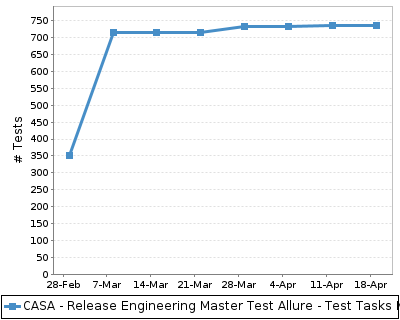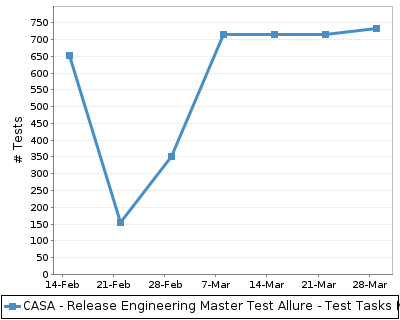 The chart below shows the number of tests across time. This provides a rough indication of the level of testing over time for the build.